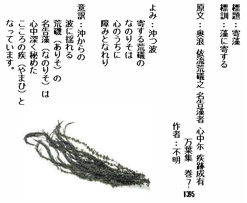 巻7-1395:沖つ波寄する荒礒のなのりそは心のうちに障みとなれり