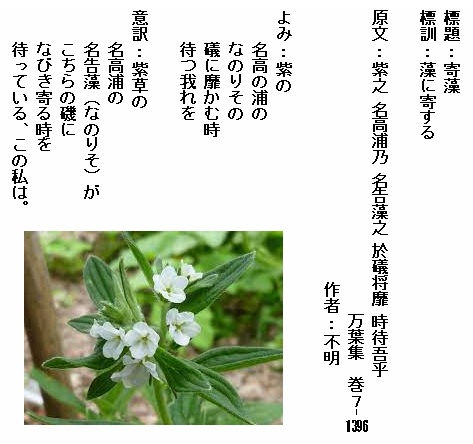 巻7-1396:紫の名高の浦のなのりその礒に靡かむ時待つ我れを