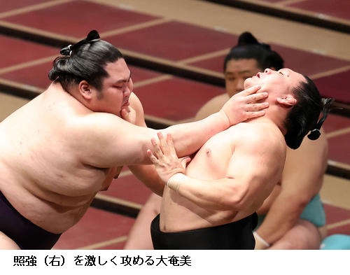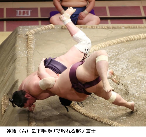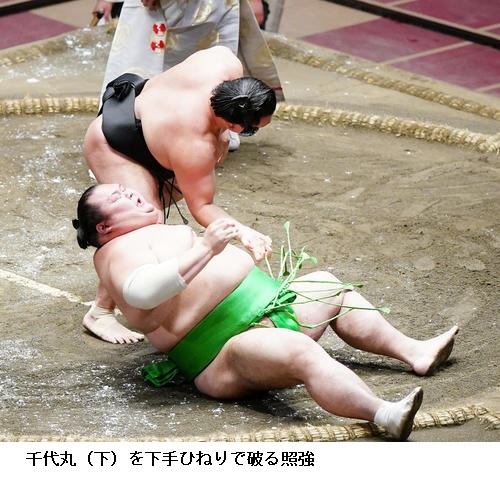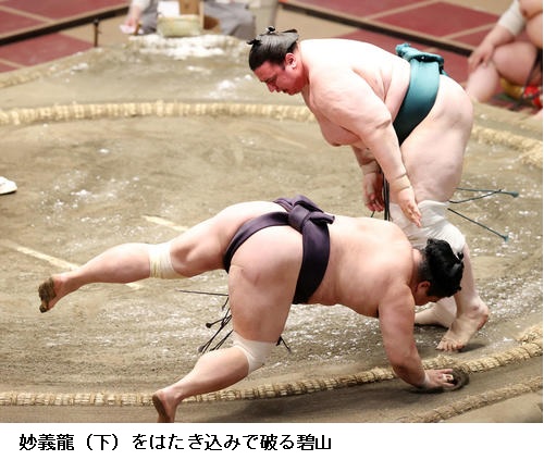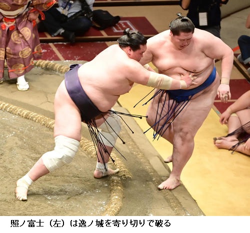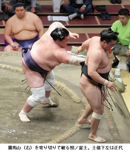 ▽妙義龍に大関 照ノ富士は照ノ富士にまげをつかんで引っぱる反則があり、妙義龍が勝ちました。照ノ富士は今場所初黒星です。
