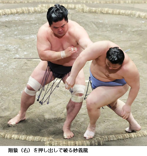 ▽翔猿に妙義龍は、妙義龍が押し出し。