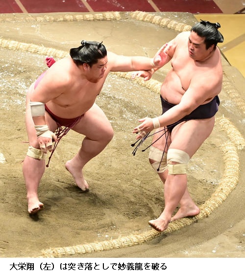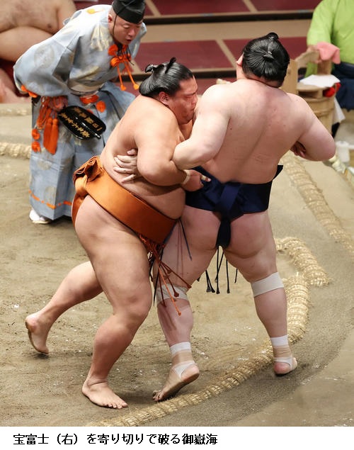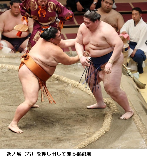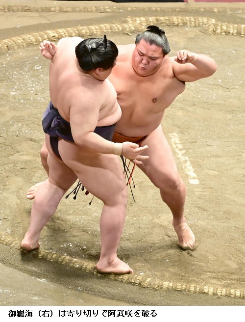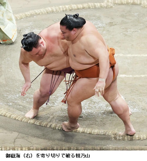 ▽御嶽海に大関 朝乃山は、朝乃山が寄り切り。