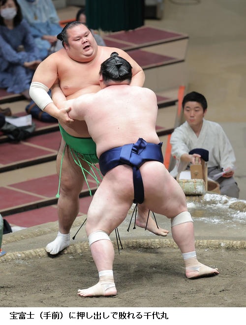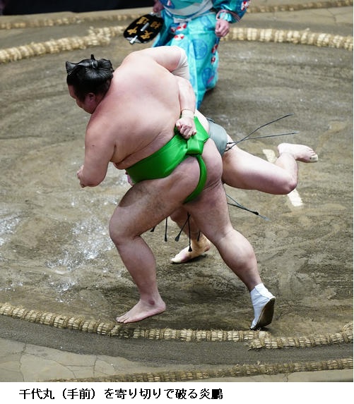 ▽十両の炎鵬に千代丸は炎鵬が寄り切り。