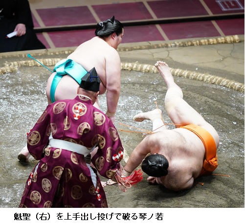 ▽琴ノ若に魁聖は琴ノ若が上手出し投げ。