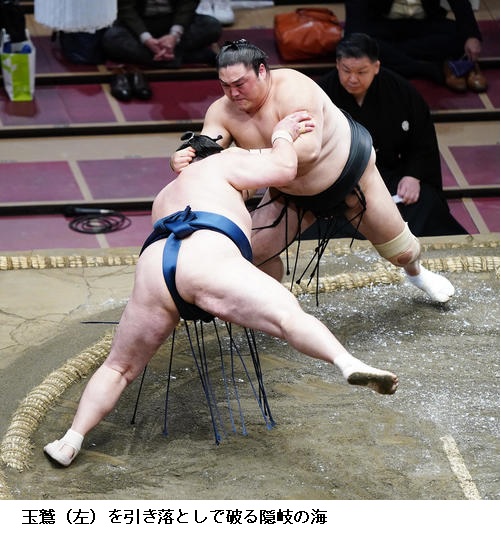 ▽玉鷲に隠岐の海は隠岐の海が引き落としで勝ち越しました。