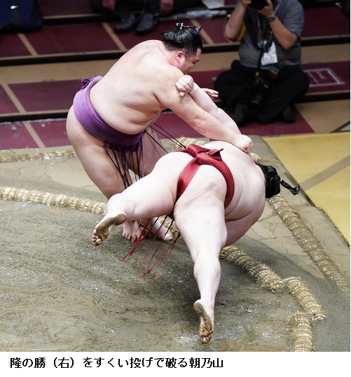 ▽大関 朝乃山に関脇 隆の勝は朝乃山がすくい投げ。