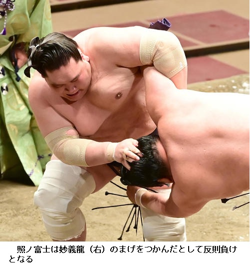 照ノ富士 反則で初黒星 まげを引っぱる 大相撲夏場所11日目 ―― 大相撲夏場所は11日目、大関 照ノ富士が妙義龍のまげをつかんで引っぱる反則がありました。妙義龍が勝って照ノ富士は今場所初黒星です。