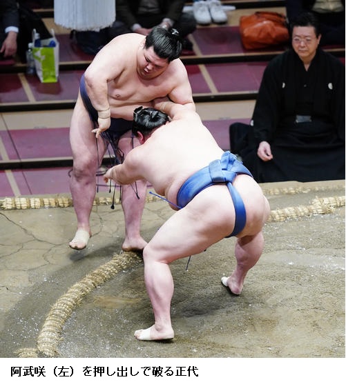 ▽大関 正代に阿武咲は正代が押し出しで勝ちました。 (NHK WEB NEWS 2021年5月19日 19時17分)