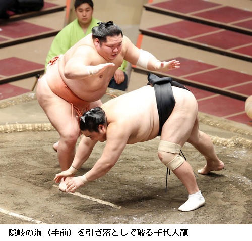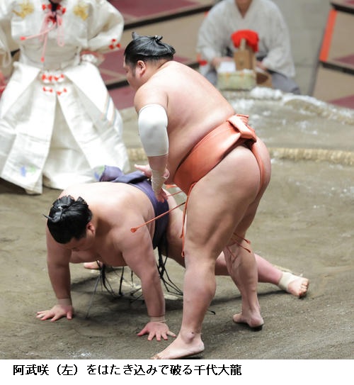 ▽千代大龍に阿武咲は、千代大龍がはたき込み。阿武咲は負け越しました。