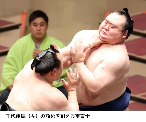 ○千代翔馬 (立ち合い変化で勝ち越し)今日はどうしても勝ちたかった。土俵に上がる前は突っ張っていこうと思ったが、最後の仕切りで決めました。