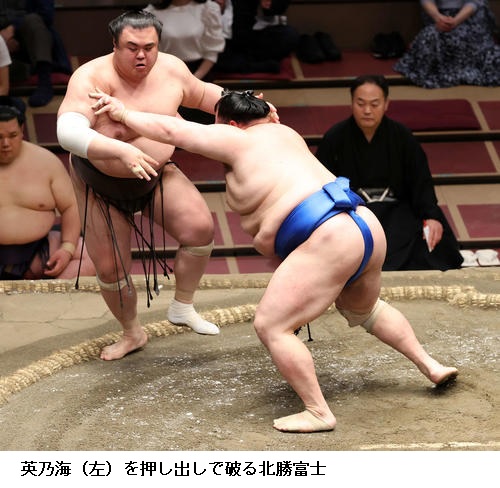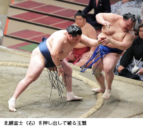 ▽玉鷲に北勝富士は、玉鷲が押し出し。
