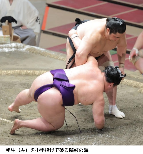 ▽明生に隠岐の海は、隠岐の海が小手投げ。
