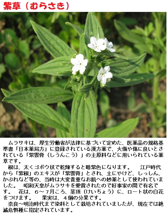 ムラサキ科ムラサキ属の多年草です。6月~7月に丘の草地に白い花を咲かせます。高さは40~70センチ程度までに成長します。根が太く、紫色の染料に利用されていました。