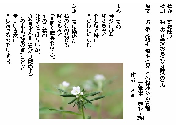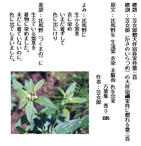 巻3-0395:託馬野に生ふる紫草衣に染めいまだ着ずして色に出でにけり