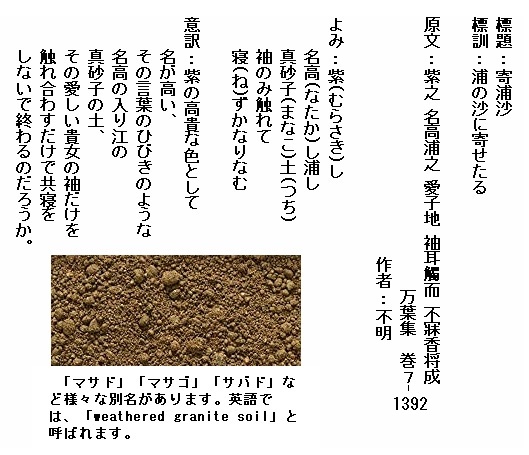 巻7-1392:紫の名高の浦の真砂土袖のみ触れて寝ずかなりなむ