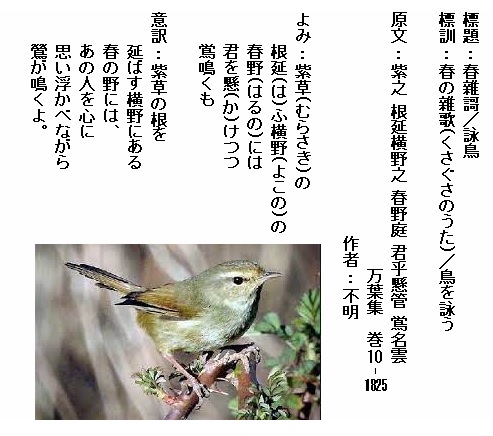 巻10-1825:紫草の根延ふ横野の春野には君を懸けつつ鴬鳴くも