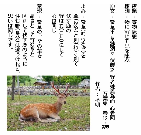 巻12-3099: 紫草を草と別く別く伏す鹿の野は異にして心は同じ