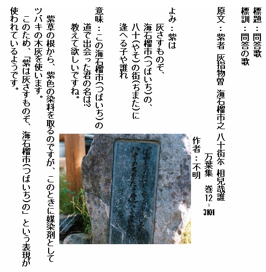巻12-3101: 紫は灰さすものぞ海石榴市の八十の街に逢へる子や誰れ