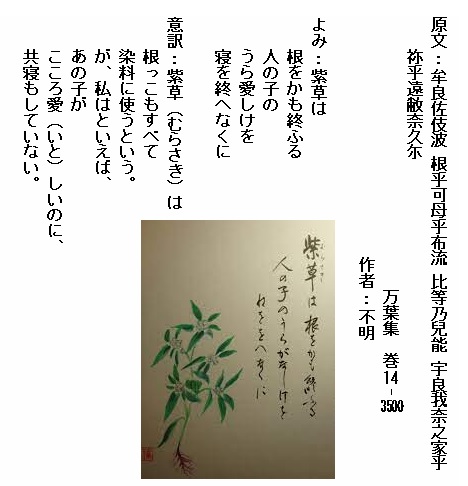 巻14-3500: 紫草は根をかも終ふる人の子のうら愛しけを寝を終へなくに