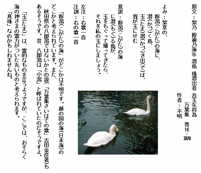 巻16-3870: 紫の粉潟の海に潜く鳥玉潜き出ば我が玉にせむ