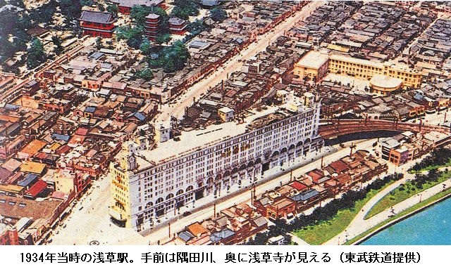 浅草駅は、もともと隅田川を挟んだ東側、現在の「とうきょうスカイツリー駅」(旧業平橋駅)だったことはあまり知られていない。一九二三年の関東大震災後、東武鉄道は悲願だった都心への進出を図ろうと、隅田川に鉄橋を渡して国鉄(現JR)上野駅までの延伸を狙った。しかし地下鉄が浅草−新橋間に計画されていたので、現在の浅草駅までしか認可されなかった。この結果、浅草駅は埼玉や栃木、群馬など北関東方面への始発駅となり、「都心への玄関口」として沿線の人たちが特別な思い入れを抱く駅になった。