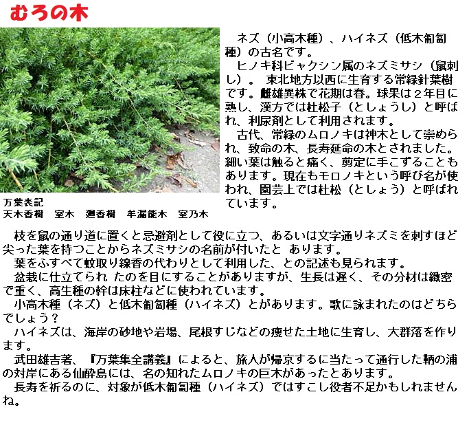 むろの木は、ヒノキ科ビャクシン属の鼠刺し(ねずみさし)です。4月頃に、花をさかせます。杉の葉に似た葉が細く鋭く、鼠さえも刺すことができることから、鼠刺し(ねずみさし)という名がついたそうです。ネズとも呼ばれます。