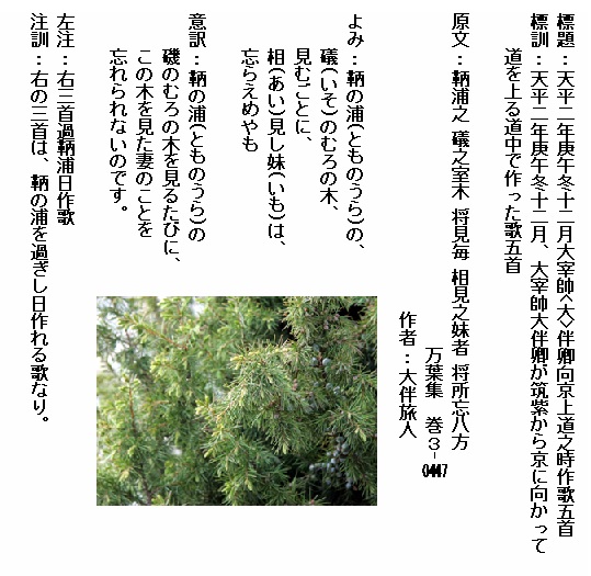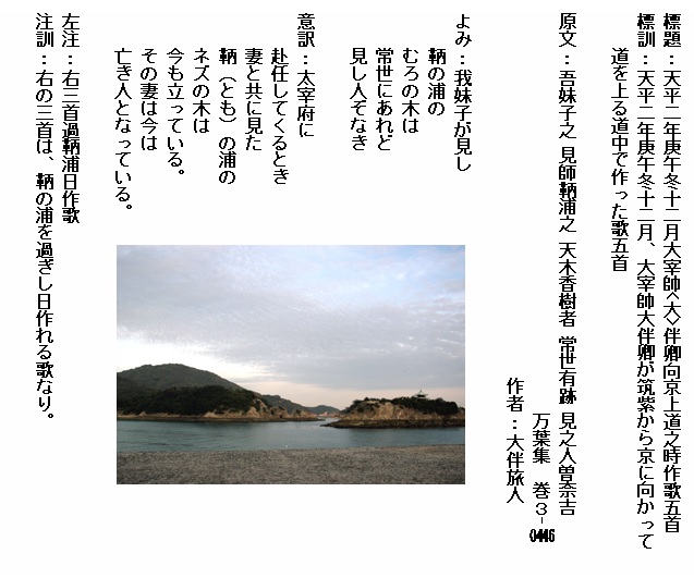 巻3-0446:我妹子が見し鞆の浦のむろの木は常世にあれど見し人ぞなき