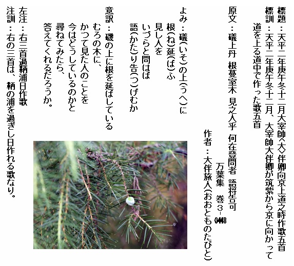 巻3-0448:礒の上に根延ふむろの木見し人をいづらと問はば語り告げむか