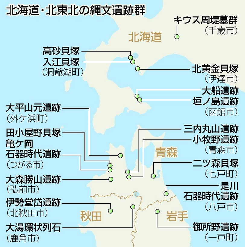登録が勧告された17遺跡は、竪穴住居跡などの集落跡や環状列石(ストーンサークル)、共同墓地などで構成。国の特別史跡に指定されている三内丸山遺跡と大湯環状列石(秋田県鹿角市)のほか、北黄金貝塚(北海道伊達市)、御所野遺跡(岩手県一戸町)などの史跡も含まれる。