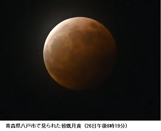 春の夜空に大きな赤銅の月 皆既月食、国内3年ぶり ―― 月が地球の影にすっぽりと入る皆既月食が26日夜、3年ぶりに日本で観測された。多くの地域で曇りや雨だったが、月が地球に近づいて大きく見える「スーパームーン」という状態と重なり、晴れた場所では午後8時9分から約20分間、春の夜の珍しい天体ショーとなった。
