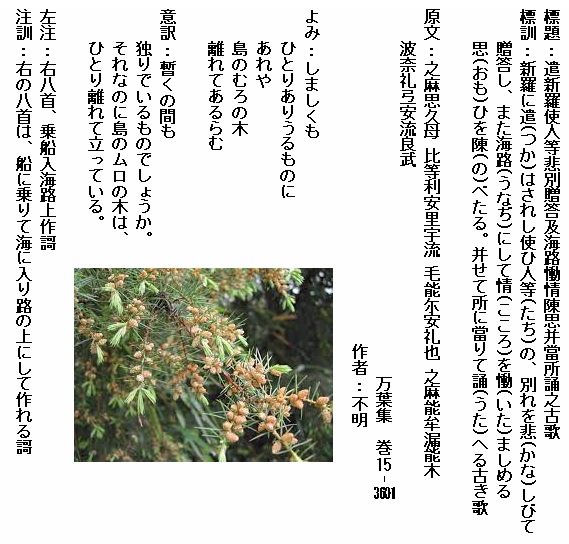 15-3601:しましくもひとりありうるものにあれや島のむろの木離れてあるらむ