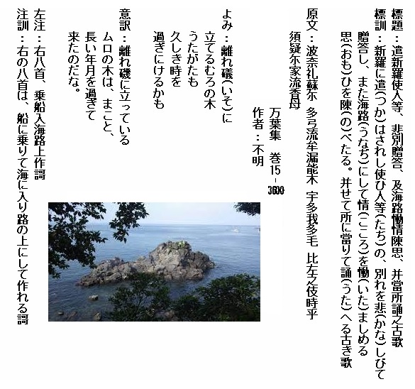 巻15-3600:離れ礒に立てるむろの木うたがたも久しき時を過ぎにけるかも