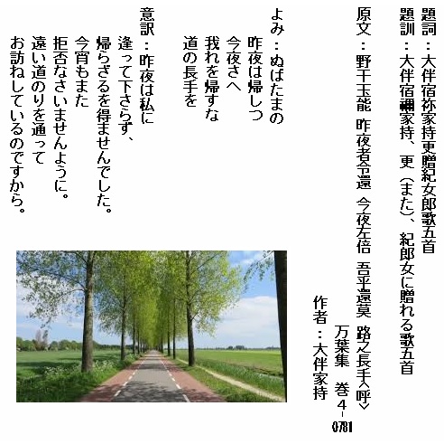 巻4⁻0781:ぬばたまの昨夜は帰しつ今夜さへ我れを帰すな道の長手を
