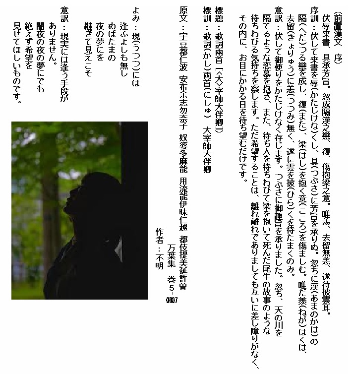 巻5⁻0807:うつつには逢ふよしもなしぬばたまの夜の夢にを継ぎて見えこそ