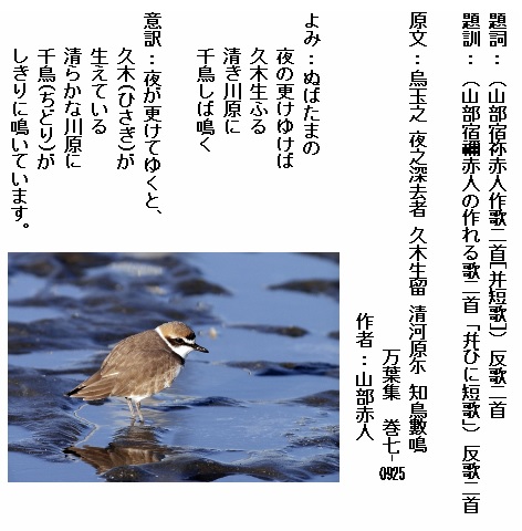 巻6⁻0925:ぬばたまの夜の更けゆけば久木生ふる清き川原に千鳥しば鳴く