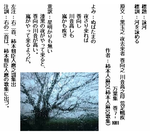 巻7⁻1101:ぬばたまの夜さり来れば巻向の川音高しもあらしかも疾き