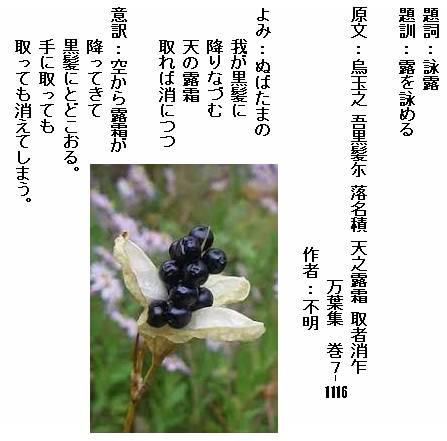 巻7⁻1116:ぬばたまの我が黒髪に降りなづむ天の露霜取れば消につつ