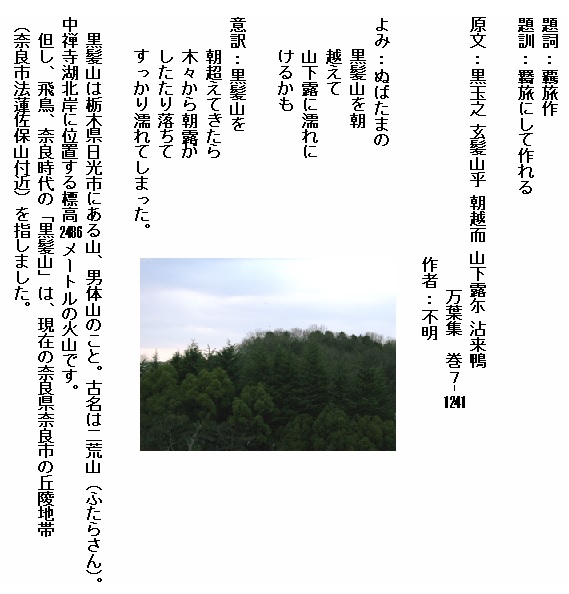巻7⁻1241:ぬばたまの黒髪山を朝越えて山下露に濡れにけるかも