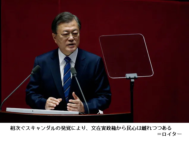 与党候補の大敗の背景には任期満了まで約1年となった文大統領の政権運営への国民の不満が高まっていることがある。最近は多くのスキャンダルに見舞われ、支持率が下がり続けていた。韓国ギャラップが2日に公表した文政権の支持率は過去最低の32%だった。