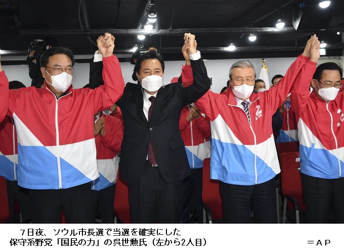 ソウル市長選は「共に民主党」の朴映宣(パク・ヨンソン)前中小ベンチャー企業相と、「国民の力」の呉世勲(オ・セフン)元ソウル市長の一騎打ちだった。韓国KBSテレビなど放送局3社が出口調査を基に予想した得票率は呉氏が朴氏を20ポイント超上回った。朴氏は7日夜、記者団に「謙虚な気持ちですべてを受け止める」と敗北を認めた。