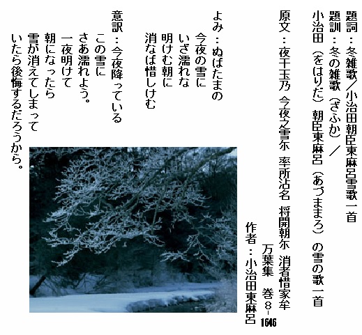巻8-1646: ぬばたまの今夜の雪にいざ濡れな明けむ朝に消なば惜しけむ