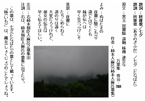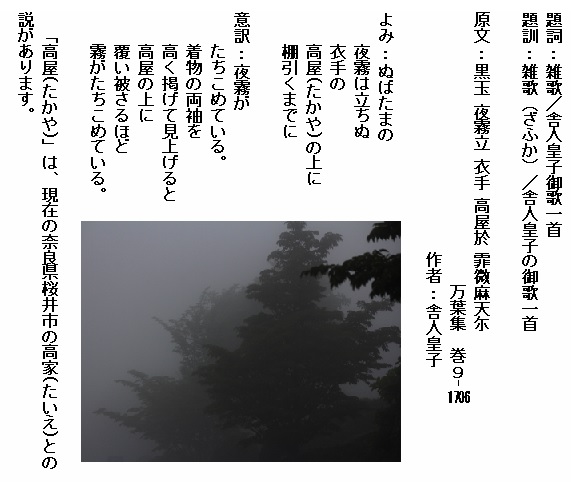 巻9-1706: ぬばたまの夜霧は立ちぬ衣手を高屋の上にたなびくまでに