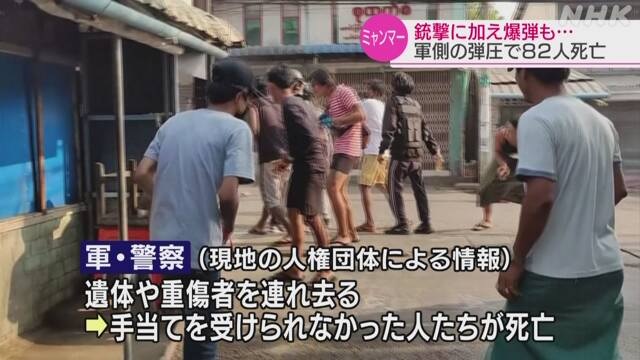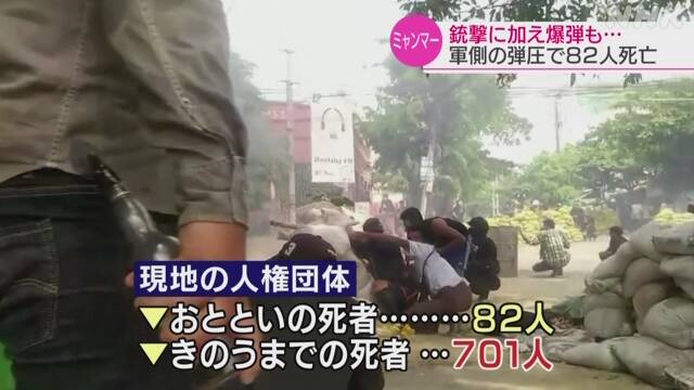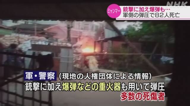 ミャンマー 1日で市民82人死亡 軍や警察が激しい弾圧 ―― 軍への抗議デモが続くミャンマーでは今月9日、中部のバゴーで軍や警察が銃撃に加えて重火器も用いた激しい弾圧を加え、現地の人権団体によりますと、1日だけで市民82人が死亡しました。