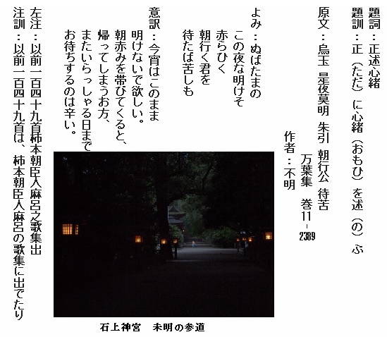 巻11-2389:ぬばたまのこの夜な明けそ赤らひく朝行く君を待たば苦しも