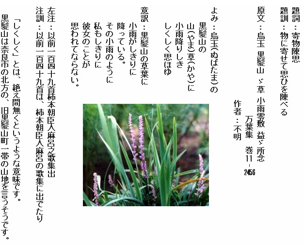 巻11-2456:ぬばたまの黒髪山の山菅に小雨降りしきしくしく思ほゆ
