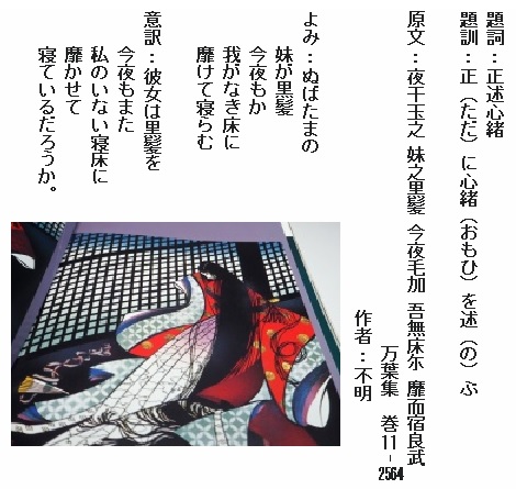 巻11-2564:ぬばたまの妹が黒髪今夜もか我がなき床に靡けて寝らむ