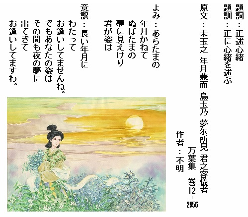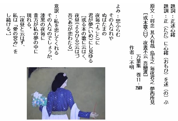 巻11-2569:思ふらむその人なれやぬばたまの夜ごとに君が夢にし見ゆる