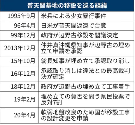 政府は18年12月から辺野古への土砂投入を始めたものの、海域で軟弱地盤が発覚し計画の見直しが必要になった。政府は19年、最短で22年度としていた普天間基地返還の時期を30年代以降に修正した。