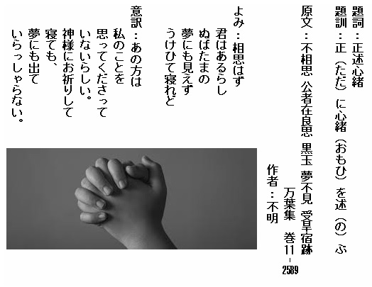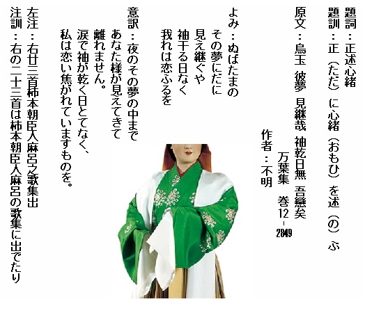 巻12-2849:ぬばたまのその夢にだに見え継ぐや袖干る日なく我れは恋ふるを