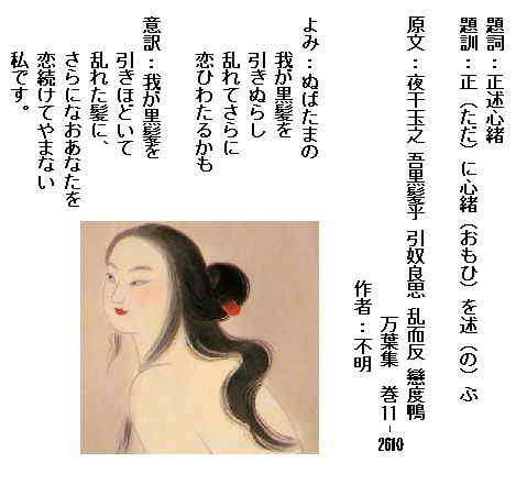 巻11-2610:ぬばたまの我が黒髪を引きぬらし乱れてさらに恋ひわたるかも