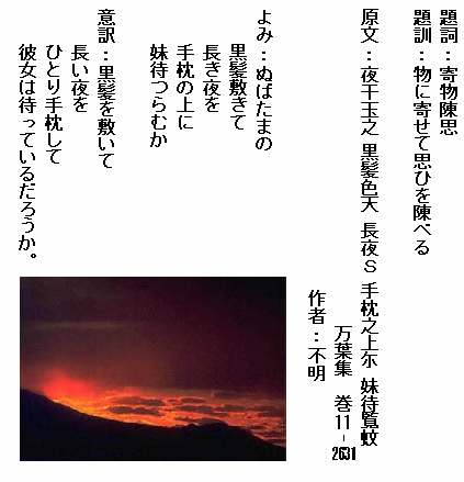 巻11-2631:ぬばたまの黒髪敷きて長き夜を手枕の上に妹待つらむか